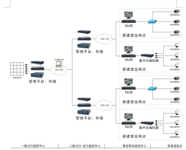 在银行面临监控大联网的当前,采用网络化结构,以监控平台为核心实现多级互联,同时整合接入报警、门禁、联动门、机房、ATM针孔等其它安防子系统,并最终实现可统一管理又可分级自治的综合安防管理系统已成为公认的主流方案。分项结构如下: