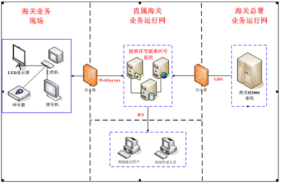 海关现场派单系统作为接单环节派单叫号系统的客户端应用,实现现场的取号、叫号、语言呼叫、显示功能。现场系统提供包括号票打印机、LED显示屏、语音设备的驱动,通过与部署在大关的集中平台接口进行数据交互实现报关单的录入验证、号码的打印、显示屏的显示、语音广播等功能。