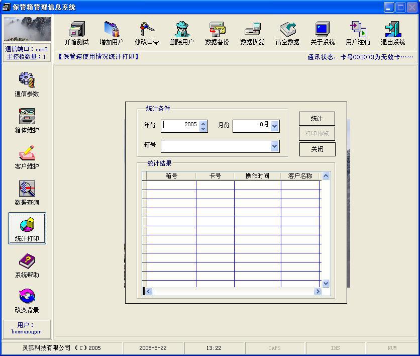 在“统计打印”项中,用户可以以保管箱的箱号和时间段来对开户操作的操作信息(如箱号,卡号,操作时间,客户名称等)进行统计,并可以通过“打印预览”打印成纸张文件。