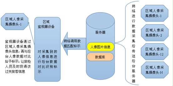 本系统由摄像机对指定地点进行监控,采集事先需监控人员照片存入数据库,通过对近期一定时间段内采集的流动人员照片进行比对并启动报警秘密信号,通知相关办案人员对其进行身份查证。