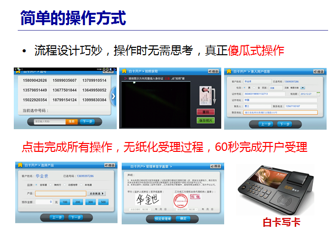 网点移动营销摆脱台席的依赖,彻底的完成流动式营销和主动式服务。生动的展现业务产品并形成互动,摆脱了在终端上身份信息录入的麻烦,流动人员能够自主的完成写卡,业务办理过程中实现了无纸化操作,流动人员自主的完成支付和票据打印