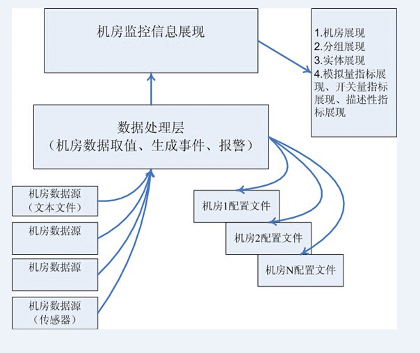 数据处理层:主要功能为采集多种机房监控探头的数据,例如采集支持SNMP协议的空调和UPS设备,通过传感器来采集机房压力、温度、湿度、漏水等信息。