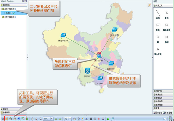 当自动发现完全网设备后,系统会自动绘制出全网的二层和三册拓扑链路,并自动根据网元类型以不同的图标展现,如下图所示: