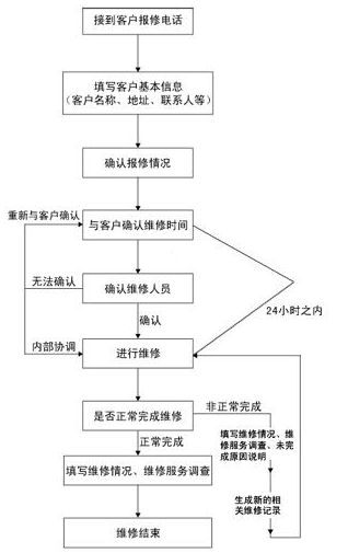 4、如因部件损坏无法立即修复的,维修人员将力争在10个工作日内修复部件并再次交客户验收,如果需要更长的维修时间的,将与客户进行协商通报。