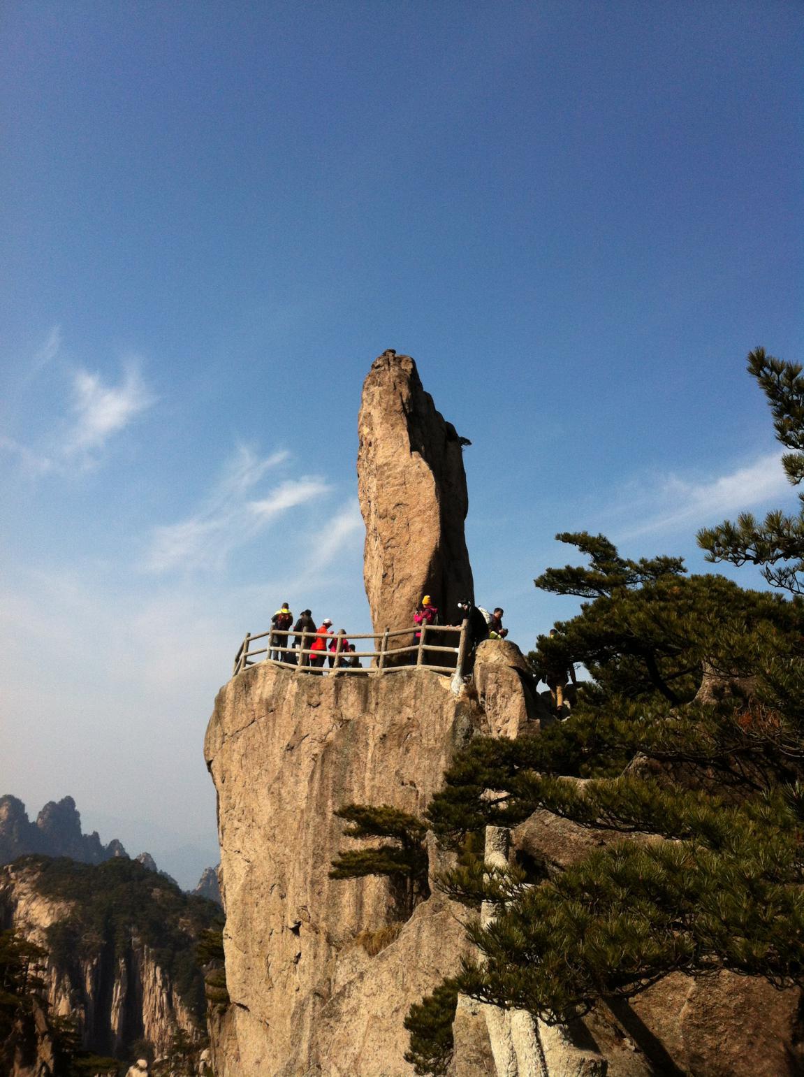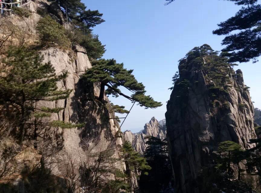 次日一早,我们来到黄山的脚下,放下行李,轻装上阵,步履飞快地走完了三分之一的路程,可爬到了一半,有一半的人主动的放弃了去光明顶。随即分化成2个小组,一个小组是继续上山,一个小组是下山回酒店。无论上山下山,周围的美景也是令人醉了。第一组经过近2小时的攀登,终于抵达目的地:光明顶。此时阳光明媚,黄山景色可以尽收眼底,苍松傲立悬崖,真可谓“不到光明顶,不见黄山景”啊。