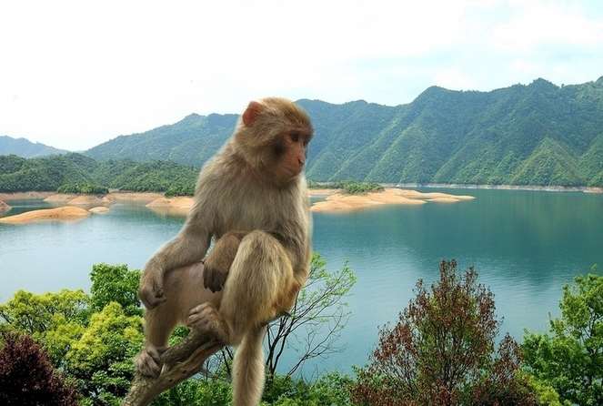 第三天,游完山当然要亲近水了,于是我们来到太平湖,太平湖介于黄山、九华山之间,所谓“两山夹一湖”。湖水全由黄山和九华山的溪水汇聚而成,清澈见底,凫鸟信飞,两岸山峦叠嶂,林海葱笼,。山水相环,翠绿互挽,真是“江南翡翠”。刚好今天有雾气,坐在船上看到水天一色,美丽妩媚。我们弃船登上一个小岛,上面大大小小的猕猴,近100多只,见有客来,众猢狲们纷纷上前迎接、上下打量,绝不希望看到空手访客,小伙伴都奉献出自己食物,孝敬给“小大圣们”吃。走时,