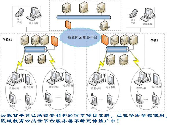我公司研发的云教育平台ECT2013,指在教育的各个领域中,利用云计算提供的服务来辅助教育教学活动。云计算辅助教学是指学校和教师利用“云计算”支持的教育“云服务”,构建个性化教学的信息化环境,支持教师的有效教学和学生的主动学习,促进学生高级思维能力和群体智慧发展,提高教育质量。也就是充分利用云计算所带来的云服务为我们的教学提供资源共享,存储空间无限的便利条件。ECT2013云教育平台具有明显的优势,改变传统教育行业数据分散、教学分离、家校分立的现状: