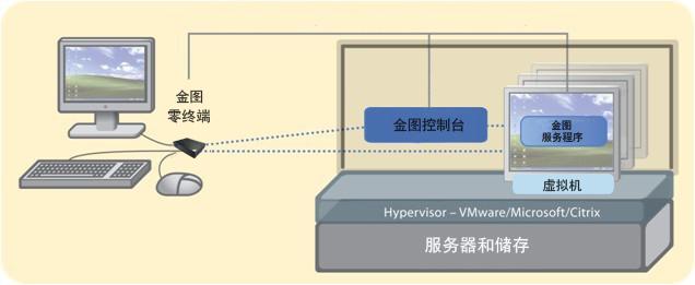 金图服务程序:一个软件组件,运行于每一个桌面虚拟机(DVM) ,并将整个用户/桌面体验通过网络交付到金图零终端设备。